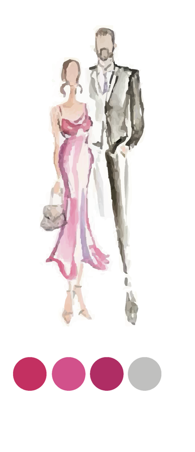 As cores dos padrinhos e madrinhas do casamento são: Rosa, Pink, Cores do espectro rosa, para as mulheres e Terno Cinza + gravata cinza para os homens.